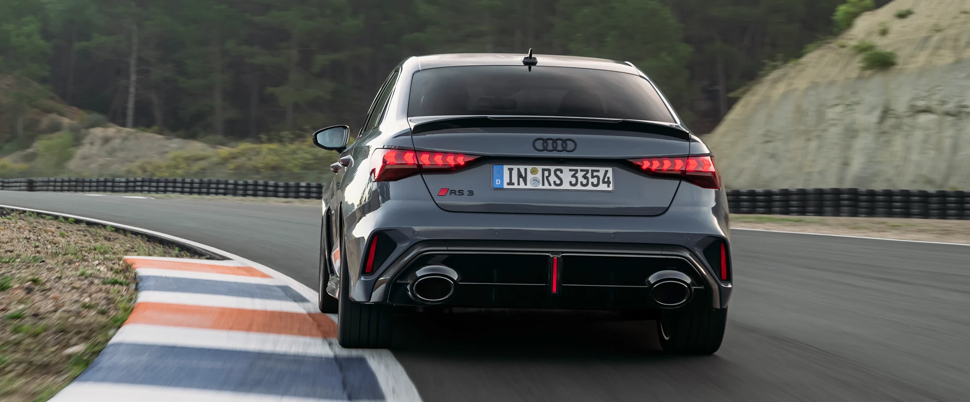 Proporções nítidas, elementos de design RS e detalhes expressivos. O novo Audi RS 3 Sedan fica ainda mais bonito na cor exclusiva RS Cinza Kemora Metálica.
